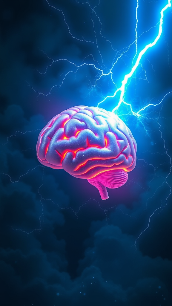 A mystical scene unfolds as a brain, vibrant and pulsating, is struck by a bright neon blue lightning bolt. In an instant, the brain transforms into a glowing orb of energy with a lustrous metallic sheen. This orb, now a beacon of newfound power, is encircled by swirling streams of luminescent energy in endless motion. The dark and mysterious environment around it is filled with faint, enigmatic shadows, creating an otherworldly atmosphere. The air seems charged with magic, and the swirling energy casts intricate patterns and textures on the orb's surface, highlighting its ethereal beauty. The scene feels both fantastical and surreal, a digital illustration that captures the moment of transcendence with vibrant clarity and detail.