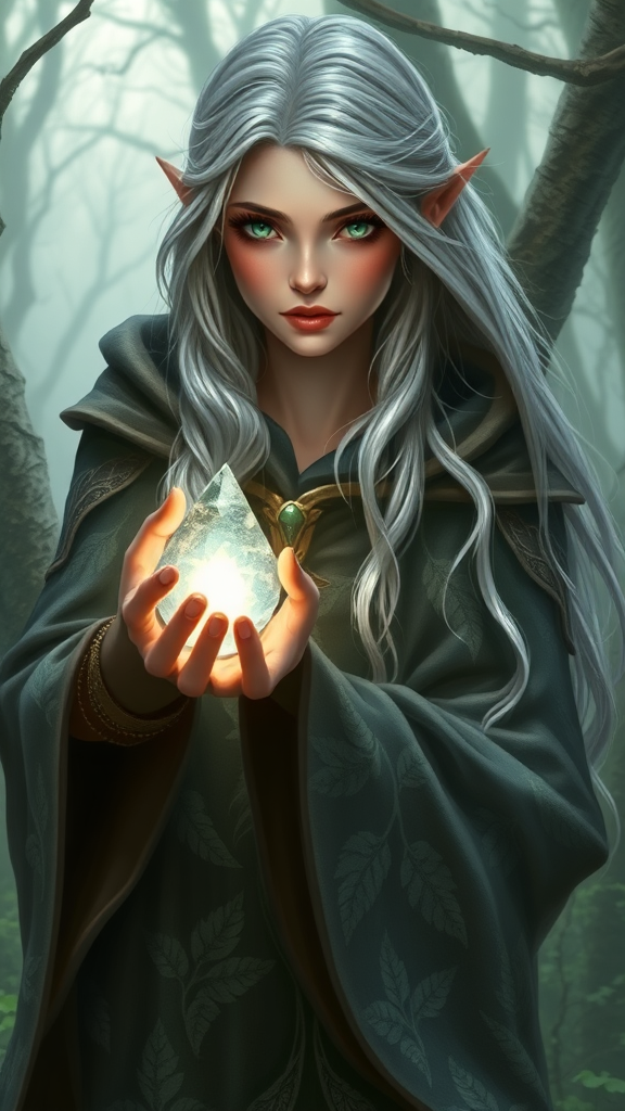 A mystical scene unfolds featuring a half-elf sorceress with enchanting green eyes, cradling a glowing crystal orb in her hand. Her long silver hair cascades over a cloak adorned with intricate leaf patterns, symbolizing her connection to the forest. The portrait captures the essence of a serene and wise forest mage, her expression calm and knowing. She stands at the edge of an ancient, enchanted woodland, where magical creatures dwell, her presence both commanding and gentle. The artwork is detailed with a matte finish, reflecting an epic fantasy style reminiscent of Magali Villeneuve and Leona Wood, capturing the ethereal and otherworldly aura of an elfic priestess in a fantasy RPG world, her gaze holding mysteries of the forest.
