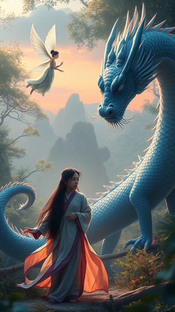 A mystical scene unfolds in a lush, enchanted forest, where a serene Chinese fairy with delicate, translucent wings hovers gracefully above the ground. Her flowing robes shimmer in soft pastels, and her eyes hold the wisdom of ancient times. Nearby, a majestic iris blue dragon, its scales reflecting every hue of the twilight sky, coils with supple grace. The dragon's eyes, deep and piercing, fixate intently on a young Chinese woman standing confidently amidst the ethereal landscape. Her traditional attire blends seamlessly with her surroundings, and her hair cascades like a river of silk. The dragon's expression is not one of anger, but rather curiosity mixed with respect for the unyielding spirit of the woman before it. In this mystical encounter, the air crackles with an unspoken understanding between the earthly woman and the ethereal creatures of legend.