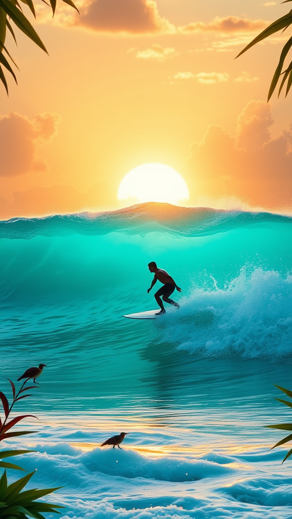 A mystical scene where a man gracefully surfs a vibrant turquoise wave off the coast of Bali, artfully capturing the enchanting essence of a Miyazaki film. The setting is reminiscent of the lush landscapes of Nausicaa Ghibli, blended with the adventurous spirit and epic scale of Breath of the Wild. The sun sets in the background, casting a golden glow over the ocean and highlighting the man's silhouette as he navigates through the powerful yet harmonious currents, feeling both tranquil and electrifying. The atmosphere is filled with whimsical creatures dancing in the breeze, while tropical flora and fauna frame the shoreline with an otherworldly beauty.