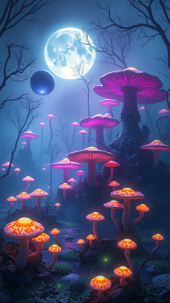 A mystical swamp enveloped in a dreamy mist, dotted with an array of vibrant, towering mushrooms glowing softly under the moonlight, creating a fantastical landscape. The scene is bathed in ethereal lighting, with colors that merge from luminescent blues to shimmering purples, and hints of emerald greens. The intricately detailed environment is captured in high resolution, reminiscent of a 4k octane render. The artistry is impeccable, echoing the trending aesthetics found on ArtStation and celebrated features on DeviantArt. The swamp exudes an otherworldly charm, inviting viewers into its serene yet enchanting realm.