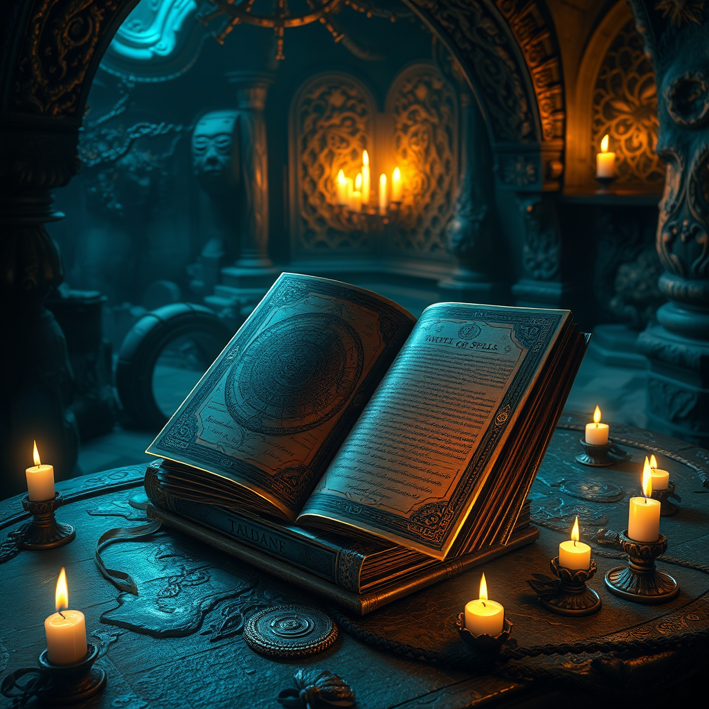 A mystical tome of spells rests on an ancient stone table in the dimly lit catacombs, surrounded by flickering candles casting eerie shadows. The book's cover is adorned with intricate arcane symbols and gilded edges that shimmer under the soft candlelight. Each page is filled with exquisitely detailed illustrations and complex magical scripts that seem to pulse with otherworldly energy. The setting is a hypermaximalist vision, filled with ornate carvings and elaborate architecture, capturing the ethereal beauty of the underground lair. The scene is rendered with unparalleled detail using cutting-edge octane render and unreal engine technologies, resulting in a breathtaking 8k visual masterpiece reminiscent of the styles of Greg Rutkowski, Peter Mohrbacher, and Magali Villeneuve, with additional fanciful elements weaving through the composition to enhance its enchanting allure.