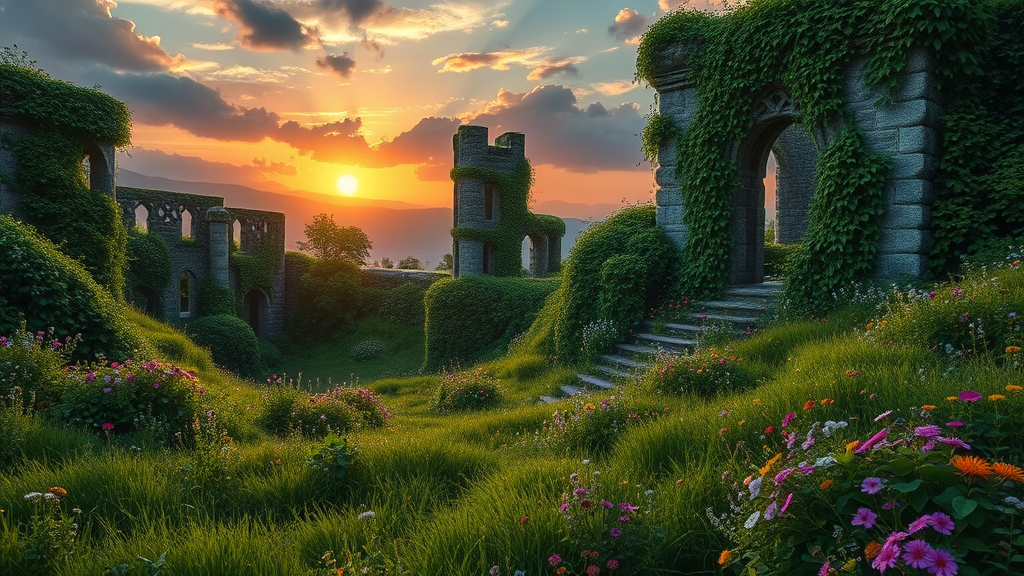 A mystical twilight descends over a fantastical, overgrown Celtic realm, where lush green meadows ripple under the soft embrace of a fading amber sunset. Wildflowers pepper the verdant landscape in a riot of colors, whispering tales of ancient lore. Towering stone structures, weathered by time, peek through the thriving foliage, their intricate Celtic carvings interwoven with vines. The air is thick with enchantment, as shadows dance across the land, painting an ethereal picture of nature reclaiming its timeless kingdom.