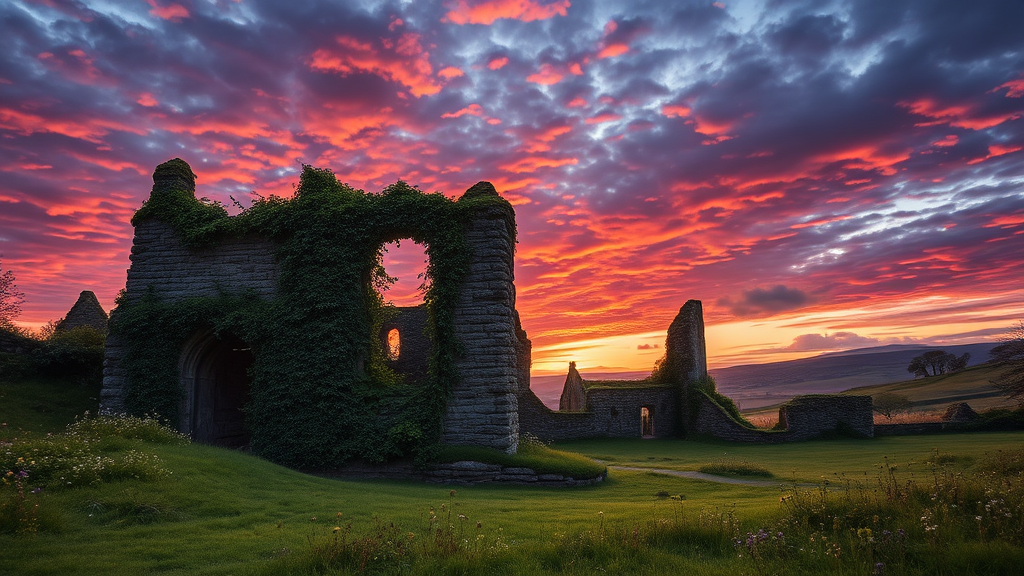 A mystical twilight settles over a fantastical, overgrown Celtic kingdom, its ancient stone ruins entwined with verdant ivy and wildflowers. The sky is a tapestry of dark purples and fiery oranges, casting a warm glow over the lush green meadows that stretch endlessly. Vines drape over weathered archways and whispering winds carry the scent of heather and moss. This enchanting scene captures a timeless world where nature and history intertwine under the somber beauty of a fading sunset.