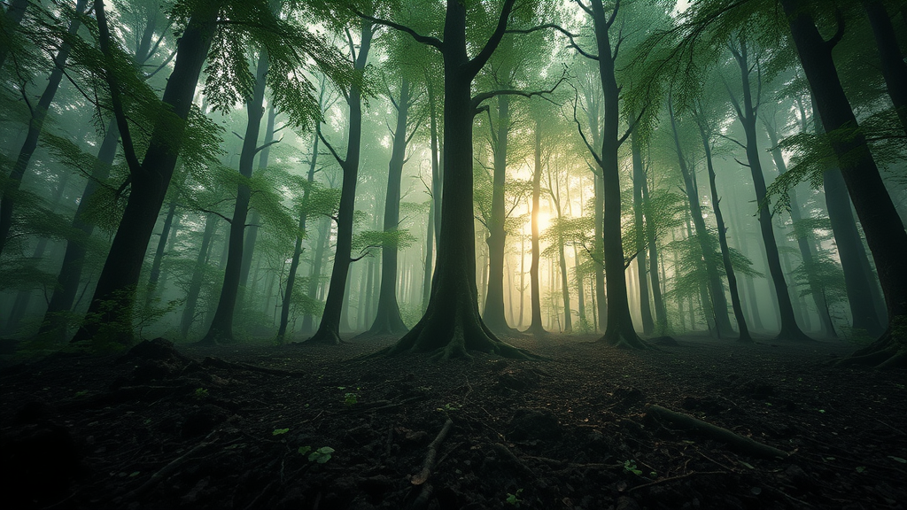 A mystical, verdant forest with towering trees reaching toward the sky, the earth beneath your feet covered in a thick layer of rich, dark soil exuding life, inspired by the hauntingly surreal style of Zdzislaw Beksinski, high definition, digital painting, atmospheric perspective, intricately detailed, hyper-realistic elements with an ethereal touch.
