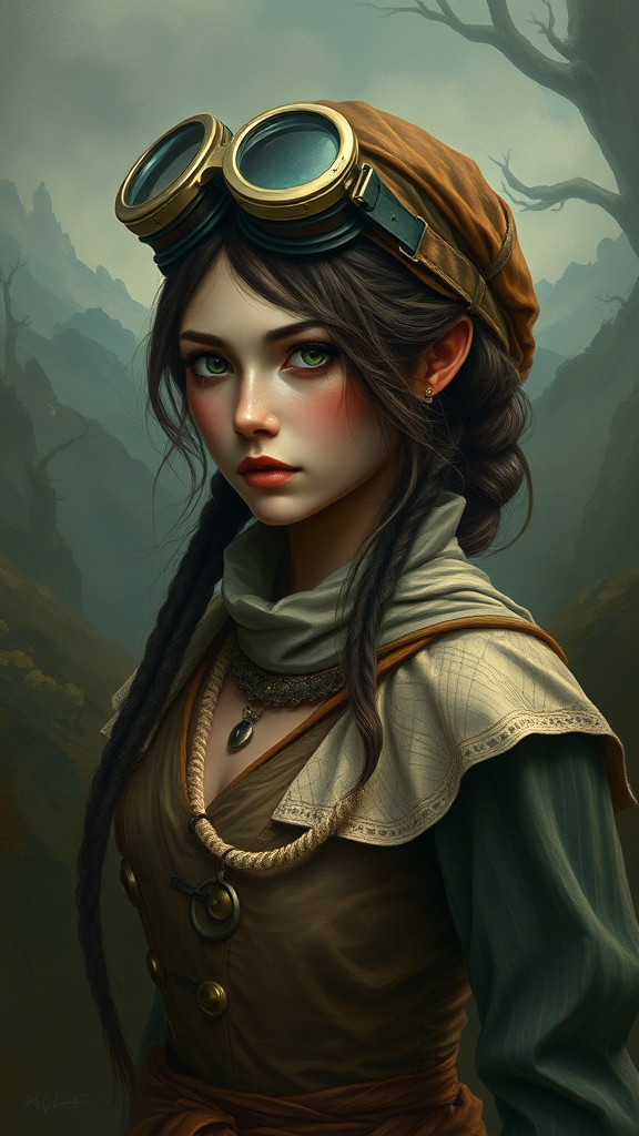 A mystical woman adorned with goggles perched atop her head, painted in a fantasy art style by Rudy Siswanto, embodying realism with intricate details; her attire is a blend of elegant fabrics and rustic textures, hinting at an adventurous spirit. Her eyes reflect wisdom and curiosity, set against a serene backdrop of a mysterious, enchanted forest. The landscape undulates with ethereal hues and shadows, adding an otherworldly charm. Her posture is confident, with an aura of mystery and exploration emanating from her presence, suggesting untold stories and journeys yet to unfold.