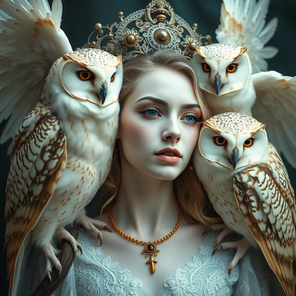 A mystical woman adorned with owls, embodying ethereal beauty, her complexion a blend of porcelain and soft azure hues. Inspired by Clifford Coffin and the Northern Renaissance, the scene is awash with tones of white and amber. A subtle Wiccan aura envelops the tableau, evoking an air of enigmatic elegance. The composition presents a dreamlike balance between darkness and light, capturing a serene harmony between the woman and her winged companions.