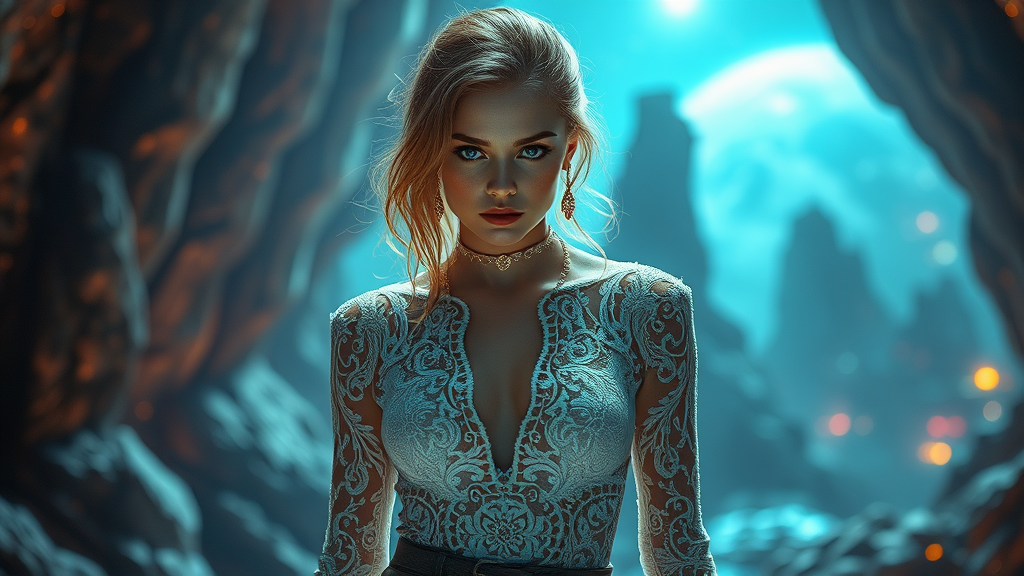 A mystical woman in a white lace and leather ensemble stands in a futuristic setting, her enigmatic gaze piercing through the surreal environment. The intricate patterns of her attire catch the dynamic light that streams from behind, casting ethereal shadows that dance around her. The high-resolution, realistically captured image portrays a world of advanced technology and dreamlike landscapes, framed with a cinematic touch. Vibrant holographic elements glitter in the atmosphere, adding layers of mystery and otherworldly allure to the scene, as the woman's presence feels both commanding and enigmatic amidst this intriguing backdrop.
