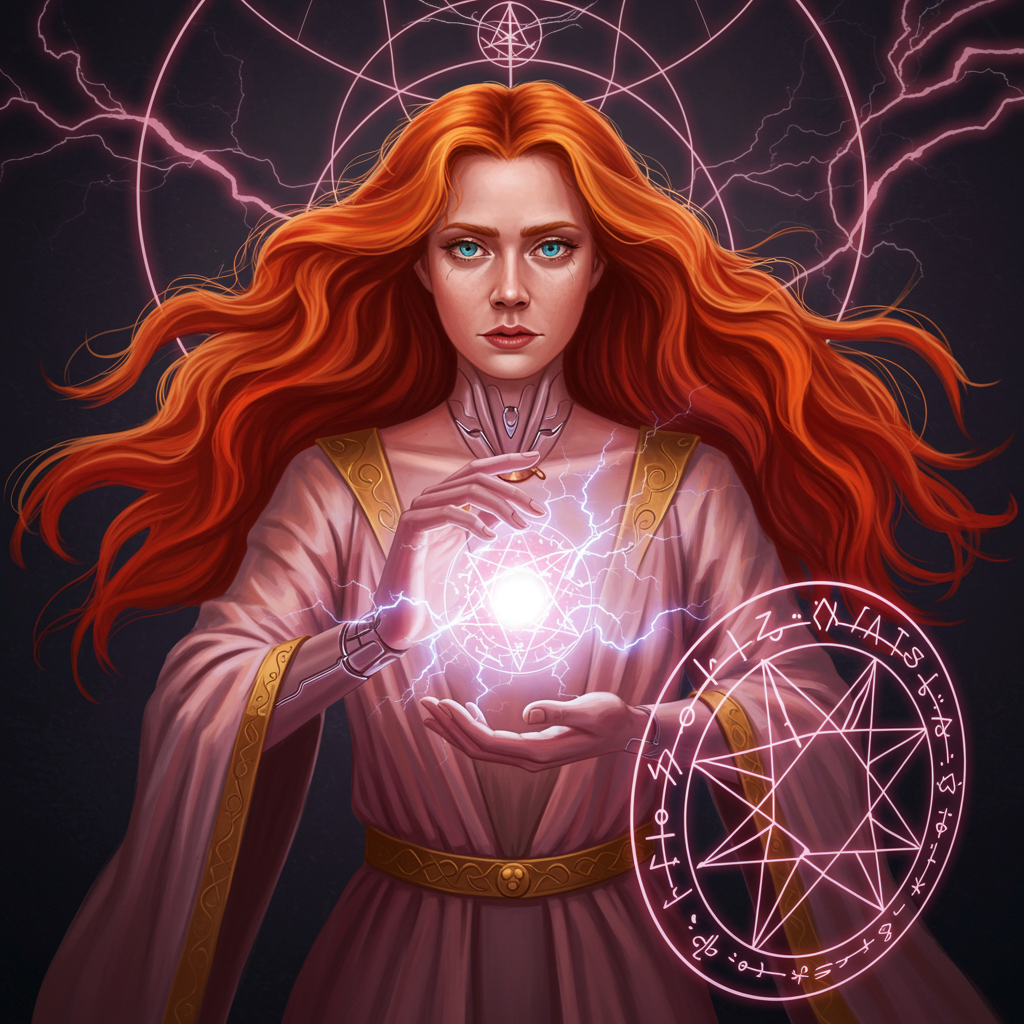 A mystical woman resembling Amy Adams stands with cascading fiery red hair, cradling a luminous orb in her hands. Her eyes, wise and ancient, tell tales of power and mystery. Clad in ethereal robes that shimmer with electric energy, she wields a pentagram shield that pulses with protective light. As a benevolent android necromancer, her presence is both enchanting and formidable. Her visage is reminiscent of the high priestess tarot card, surrounded by an aura of divine wisdom and grace. Her essence evokes the spirit of a Celtic goddess, akin to Diana, and her stance is that of an anime goddess, capturing a balance between strength and serenity. This captivating portrait, worthy of a place on ArtStation, radiates a fusion of fantasy and futurism, with hints of a lightning mage’s spell icon shimmering subtly around her.