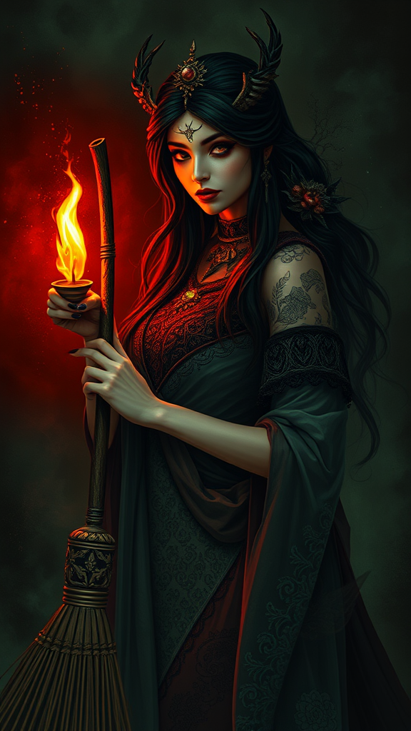 A mystical woman stands gracefully before a flickering flame, clutching a broomstick with an aura of enchantment. Her presence resonates with the essence of otherworldly beings, enveloped in a rich palette of dark green and deep red hues. Her detailed facial features are reminiscent of Jan Matejko's artistry, exuding a captivating blend of beauty and intensity. Her attire and surroundings are adorned with intricate patterns inspired by Dayak art, infusing the scene with cultural depth. Subtly, a zombiecore aesthetic weaves through the scene, adding a touch of eerie elegance, as spectral shadows dance around her, completing this mesmerizing tableau.