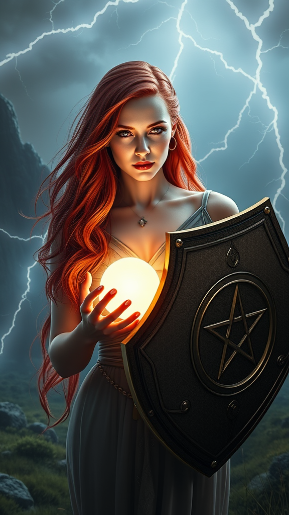 A mystical woman with cascading red hair, her serene face resembling Amy Adams, stands in a surreal landscape. In her hands, she cradles a radiant, glowing orb, its light casting ethereal shadows. Her other arm confidently holds a shield embossed with an intricate pentagram, symbolizing her mystical prowess. Lightning crackles around her, suggesting the power of a mage's spell. Her aura is a blend of steel and warmth, a benevolent android necromancer imbued with ancient knowledge. She embodies the essence of a high priestess, reminiscent of a tarot card come to life. Her eyes glimmer with wisdom, akin to a Celtic goddess, her presence echoing the ethereal beauty of Diana. This fantastical figure is worthy of display on ArtStation, an anime goddess brought to life in intricate detail, merging technology and magic in harmony.