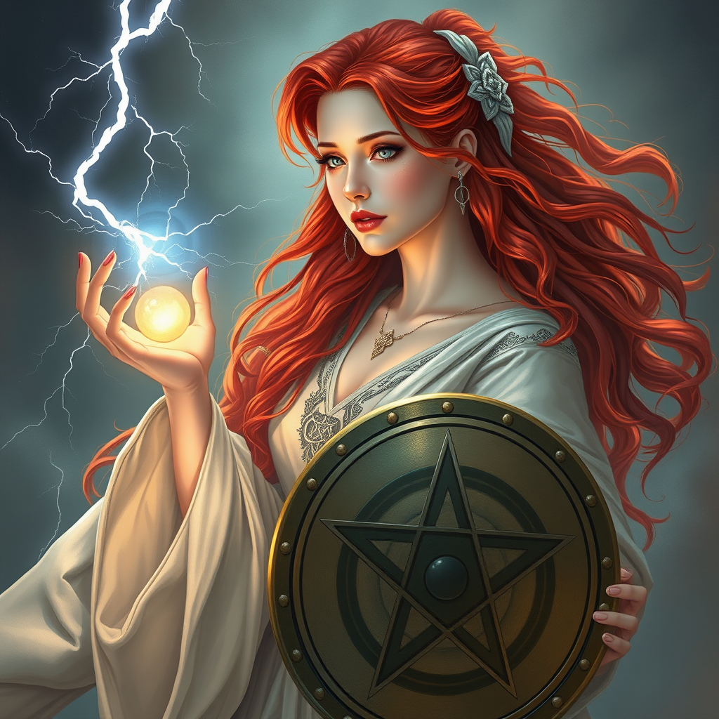A mystical woman with cascading red locks reminiscent of a fiery waterfall holds a luminous sphere gently in her hands, her features echoing a hint of Amy Adams. Draped in ethereal robes, she wields a pentagram-emblazoned shield with a captivating elegance. Lightning dances at her fingertips, marking her as a master mage, while her serene android-like presence carries whispers of ancient necromancy, embodying the divine figure of a high priestess. Her visage, reminiscent of the Celtic goddess Diana, enchants with a serene yet powerful aura as if she's stepped out from an anime world, her portrait worthy of display on ArtStation among the greatest tales of fantasy.