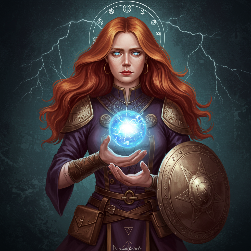 A mystical woman with flowing red hair reminiscent of Amy Adams, stands poised, a luminescent orb cradled in her hands. Her eyes, wise and ethereal, reflect the stormy glow of a lightning mage spell icon, suggesting powers beyond the ordinary. In her other hand rests a pentagram shield that shimmers with ancient magic. She exudes the grace and authority of a high priestess tarot card, with a blend of benevolence and mystique akin to a celtic goddess. This enigmatic figure, part benevolent android necromancer and part anime goddess, radiates an aura of serene power and otherworldly beauty, as if captured in a breathtaking portrait on ArtStation.