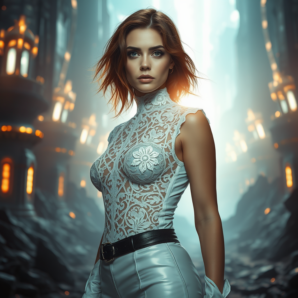 A mystical woman with striking features in a white lace and leather ensemble stands in a futuristic, dreamlike landscape. The environment around her is filled with ethereal and surreal elements, showcasing towering structures and shimmering lights that create an otherworldly atmosphere. Dynamic light casts a radiant glow from behind, highlighting her silhouette in a cinematic and dramatic fashion. Her attire merges classic elegance with modern edge, intricate lace patterns interweaving with sleek leather panels, capturing both grace and strength. The scene evokes a sense of mystery and wonder, as if she is part of an enigmatic narrative that unfolds in this high-resolution, hyper-realistic portrayal by a masterful photographer.