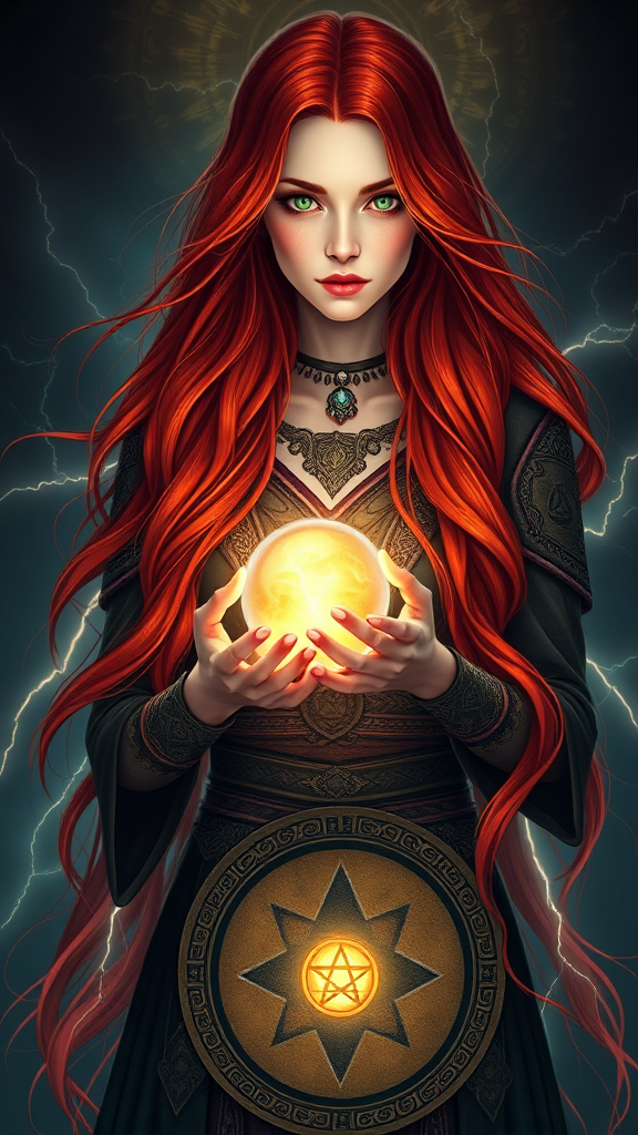A mystical woman with strikingly long, flowing red hair that cascades around her like a fiery waterfall, stands gracefully with a glowing, ethereal orb cradled in her hands. She bears a resemblance to Amy Adams, with a serene yet commanding presence. Her attire is intricate, adorned with symbols and patterns reminiscent of a benevolent android merged with ancient magic. A pentagram shield rests by her side, subtly glowing with protective energy. Her emerald green eyes exude wisdom as she wields the essence of a lightning mage spell, crackling with energy. Her aura is that of a high priestess, embodying the divine essence depicted in a tarot card. She is an anime goddess personified, her visage echoing the grace and power of a Celtic goddess, like Diana. Her presence is both otherworldly and deeply rooted in ancient lore, capturing the attention and admiration of all who gaze upon her, as if a revered piece on ArtStation or CGSociety.