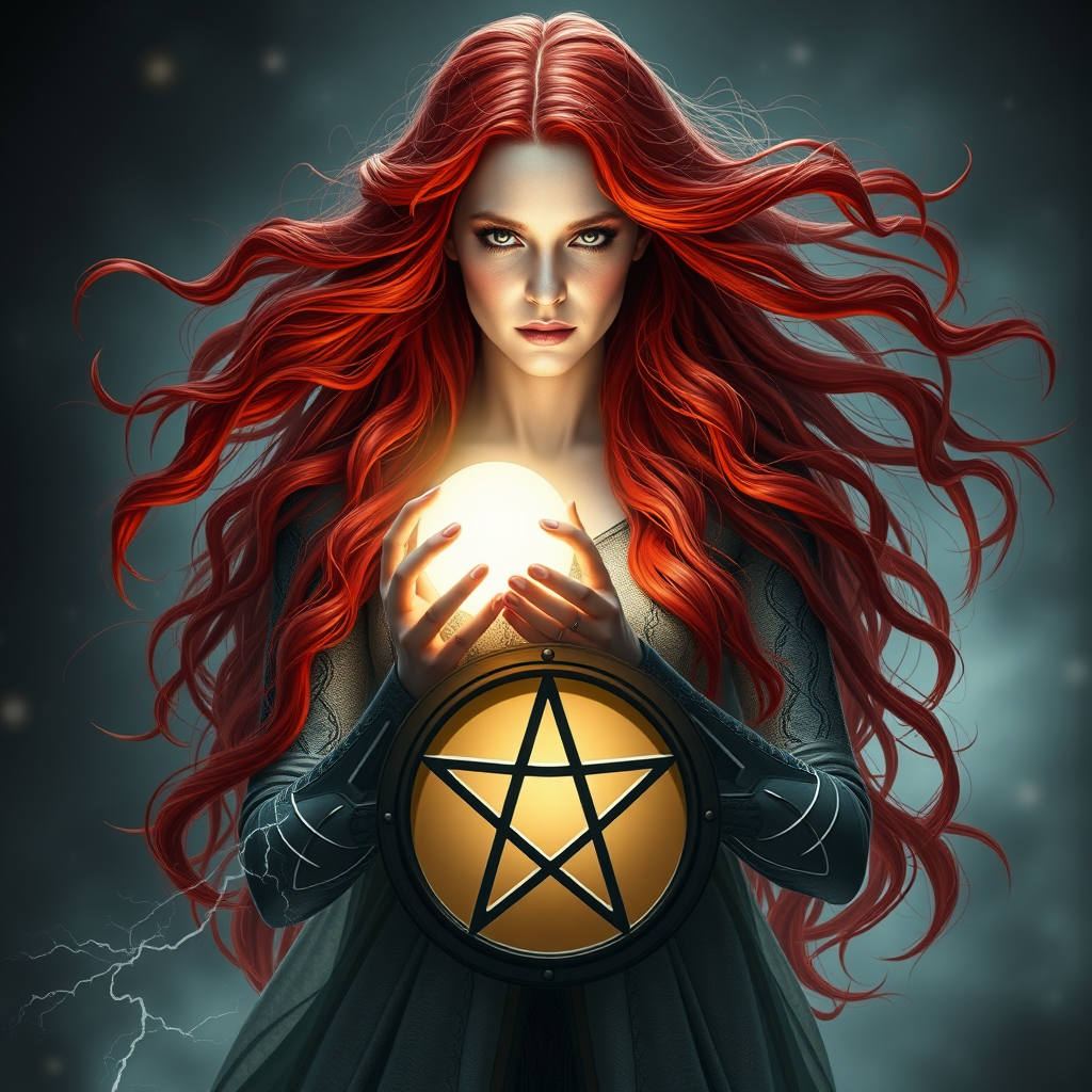 A mystical woman with very long flowing fiery red hair stands majestically, holding a radiant orb in her hands, her features reminiscent of Amy Adams. Her ethereal presence is depicted with a pentagram shield that glows softly at her side. She exudes an aura of magic as a lightning mage spell icon hovers around her, hinting at her formidable powers. As a benevolent android necromancer, her form is both organic and metallic, seamlessly blending fantasy and technology. Her powerful presence echoes that of the High Priestess tarot card and she embodies the divine essence of an anime goddess. Captured with the grace and elegance of a Celtic goddess, inspired by Diana, this striking portrait is worthy of being featured on CGSociety and ArtStation.