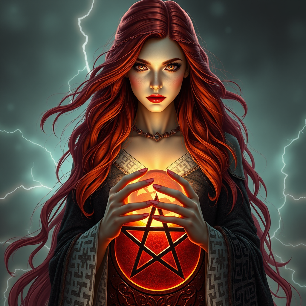 A mystical woman with very long flowing red hair resembling Amy Adams stands with a glowing orb cradled in her hands, her gaze intense and ethereal. She holds a pentagram-etched shield, casting a protective aura reminiscent of a lightning mage spell icon. Her presence suggests a benevolent android necromancer, a high priestess with an air of wisdom and power, blending elements of anime goddess and Celtic deity. Her serene expression mirrors the divine essence of a Celtic goddess, akin to Diana, as if she belongs on a high-fantasy art platform like CGSociety or ArtStation.