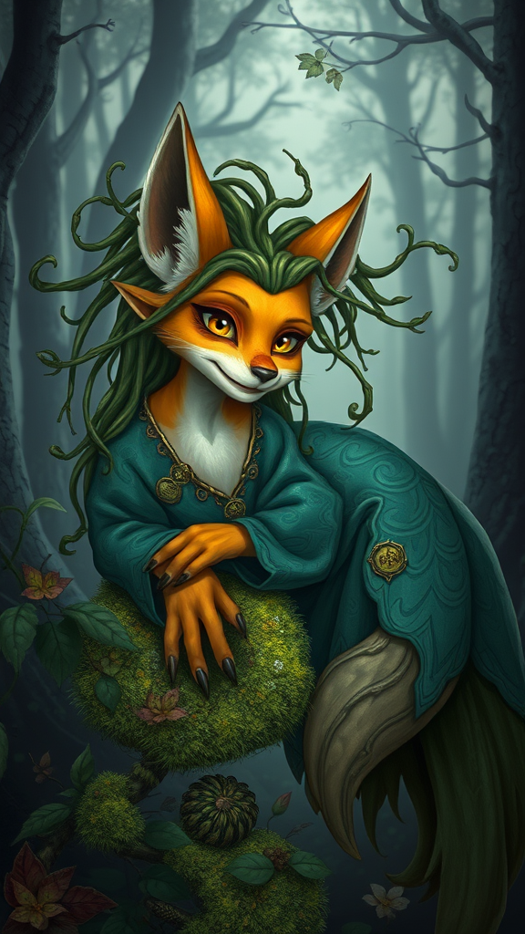 A mystical woodland setting reveals a portrait of a mischievous trickster spirit, featuring fox-like ears and a playful grin. Its eyes sparkle with intelligence and cunning, as it lounges atop a moss-covered stone. The style echoes the enchanting intricacy of John Bauer's art, with detailed patterns woven into the spirit's flowing garments and wild, vine-like hair. The vibrant color palette captures the essence of the forest at twilight, hues of deep emerald, sapphire, and amber blending harmoniously. Soft, diffused light casts a gentle glow, enhancing the dreamy and otherworldly atmosphere. In the background, shadowy trees and whispering foliage hint at ancient secrets, completing the magical tableau.