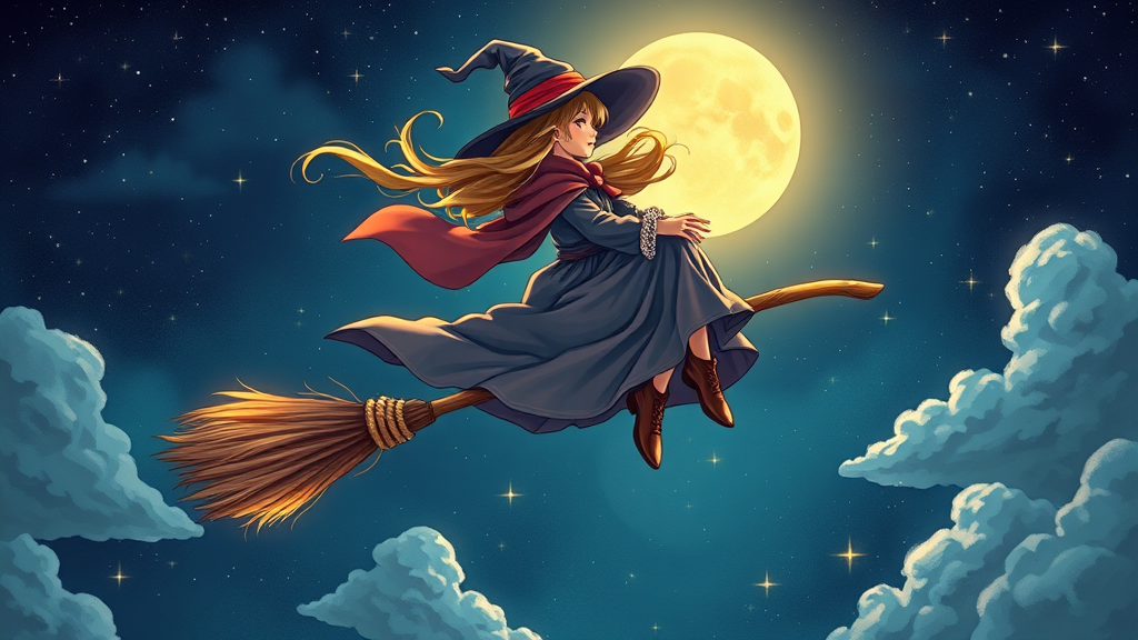 A mythical and enchanting illustration featuring a skilled young witch flying solo on her broomstick through the night sky, set against a backdrop of twinkling stars and a luminous moon. The scene captures the essence of freedom and adventure, as the wind gently whips through her flowing hair and billowing cape, while her pointed hat exudes a whimsical charm. Her boots rest confidently on the broomstick, which emits a subtle glow, highlighting her mastery of magic and spells. Whirling clouds add an element of mystery, as the vibrant colors and intricate details bring this fantastical world to life. This ultra-detailed representation is rich with the enchanting beauty and imaginative wonder of fantasy culture, drawing on elements of mythology, fairy tales, and folklore. The composition skillfully balances the scales of foreground, middle ground, and background, with a keen eye for perspective, light, color, and texture, creating a breathtaking sense of movement and energy.