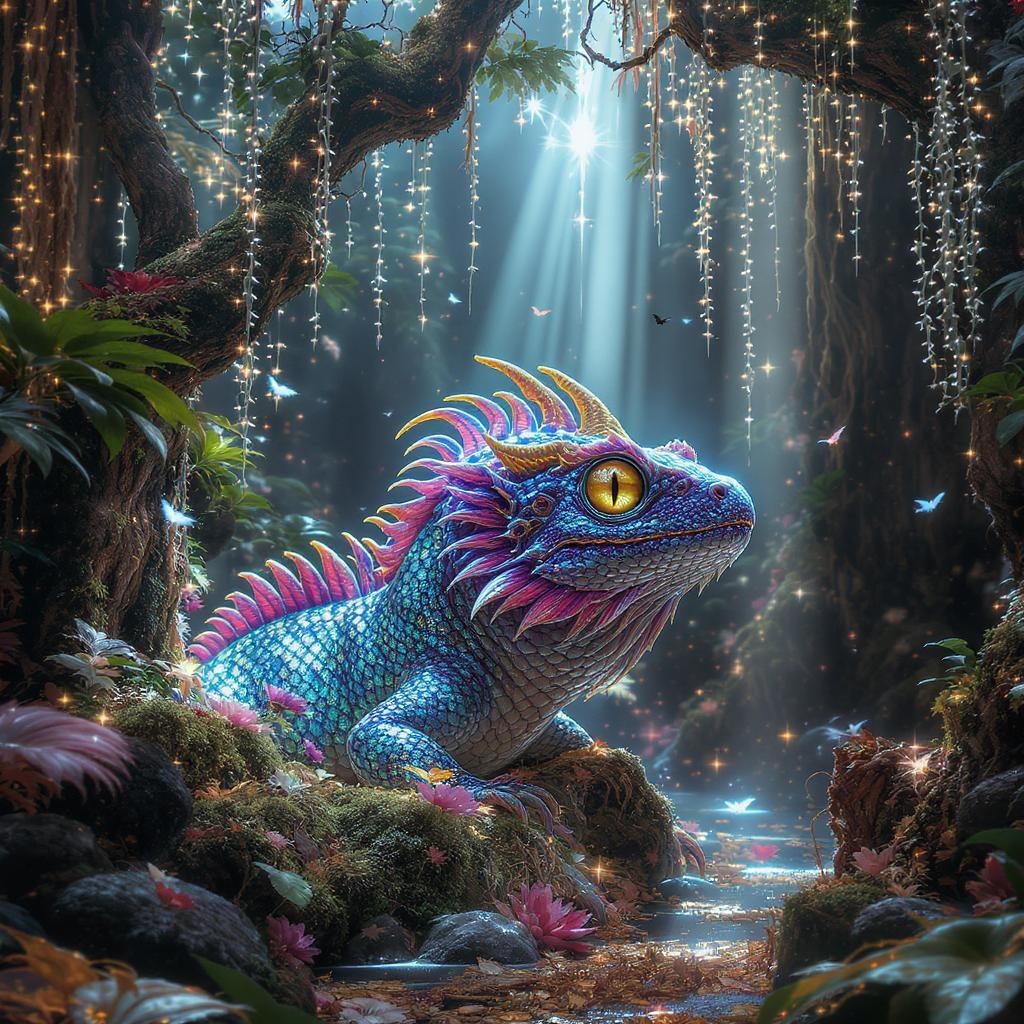 A mythical creature nestled in the vibrant jungle, its scales shimmering with iridescent hues under the enchanting fairy lights, capturing every minute detail in striking clarity, surrounded by lush foliage and colorful flora. The atmosphere is alive with bright colors and the mystical dance of volumetric light rays piercing through the canopy, all rendered in stunning photorealism with a high dynamic range. The creature's curious eyes glint with intelligence as it blends harmoniously into this magical landscape.