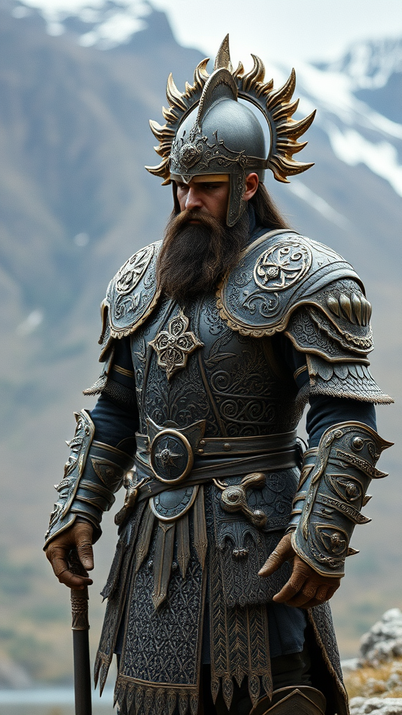A mythical Norse deity, once believed to have vanished eons ago, stands resplendent in intricately carved, divine armor adorned with ancient symbols of power, captured beautifully in the natural grain of Portra 200 film on a Canon D500, evoking a sense of history and mystery through its rich, warm tones and extraordinary detail, set against a breathtaking Nordic landscape.