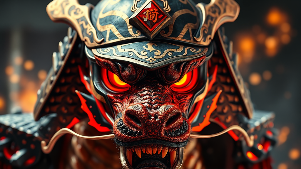 A mythical samurai dragon with fiery eyes, surrounded by shimmering crystal stones, wearing a helmet with striking tiger stripe patterns, captured in an intensely close angle. The scene is rendered in 8k ultra-realistic detail, with dramatic photography-style lighting, showcasing an ultra-detailed, lifelike portrayal, emphasizing the vibrant colors and textures.