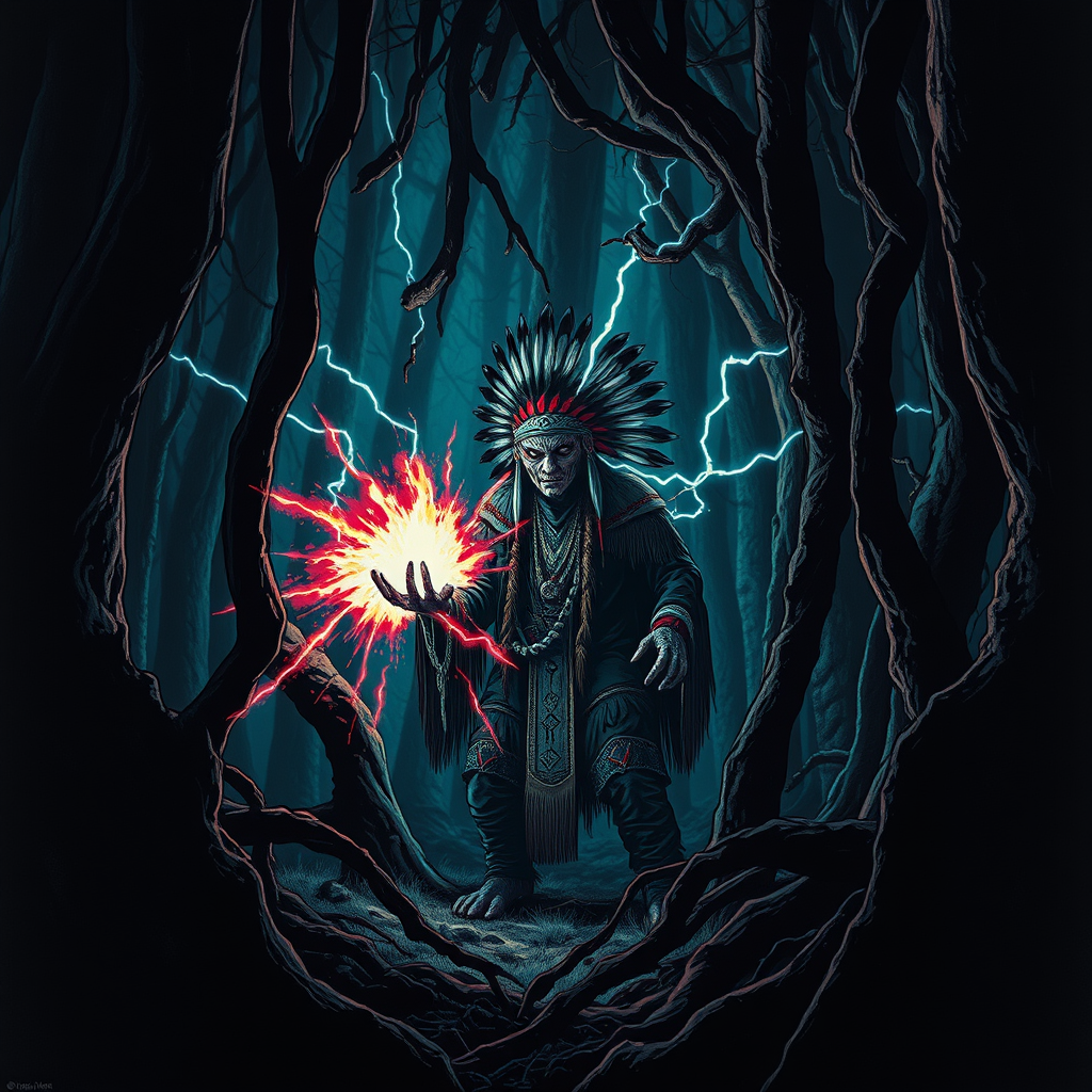 A Native American evil spirit lurks in the dense, shadowy woods, its sinister presence captured in the style of night photography with intense color saturation. Vivid energy explosions crackle around the spirit, illuminating the scene with a supernatural glow that casts eerie shadows among twisted trees. The aesthetic pays homage to EC Comics, with bold, dramatic lines and striking contrasts that bring to life the terrifying beauty and haunting mystery of this otherworldly encounter.