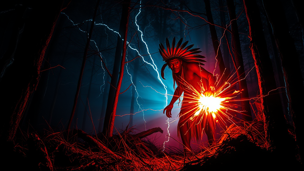 A Native American evil spirit lurks ominously amidst shadowy woods, captured in the style of eerie night photography, with intense color saturation illuminating the scene. Vivid bursts of supernatural energy crackle through the air, as the spirit's malevolent presence distorts reality. The visual echoes the dynamic and dramatic storytelling of EC Comics, invoking an atmosphere both mesmerizing and haunting.