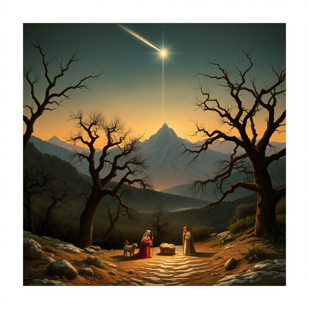 A nativity scene envisioned by Caspar David Friedrich, blending themes from his renowned landscape works. Set against the serene backdrop of the Orient, the final whispers of sunlight bathe the gentle mountains in a warm glow, while a luminous comet gracefully illuminates the dusky sky. The landscape is devoid of snow, with ancient, gnarled trees framing the scene. In the foreground, the figures of the nativity appear amidst this tranquil setting, their presence harmonizing with the ethereal beauty of the surroundings.