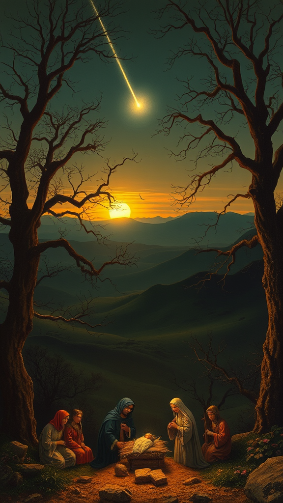 A nativity scene envisioned by Caspar David Friedrich, where elements from his renowned landscapes are interwoven. The sun sets gently behind rolling hills, casting golden hues that merge with the soft twilight. A brilliant comet illuminates the vast, darkened landscape below. This scene unfolds in an Eastern setting, devoid of winter's snow, yet enveloped in an air of mystical serenity. Dating, ancient trees, with their gnarled branches, frame the scene. In the foreground, the figures of the nativity gather in quiet reverence, their forms softly blending with the ethereal light of the surroundings.