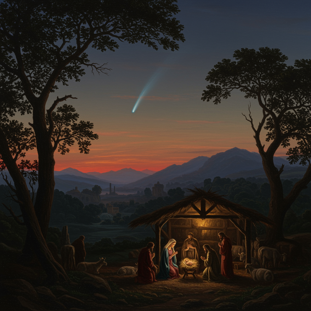 A nativity scene envisioned by Caspar David Friedrich, drawing inspiration from his iconic landscapes, captures the serene final glow of twilight over gentle Eastern mountains. A radiant comet illuminates the dusky horizon, casting its ethereal light upon an expansive, snowless Oriental landscape. Age-old trees, their gnarled branches reaching skyward, frame the scene with a natural grandeur. In the foreground, the figures of the nativity gather, their forms softly outlined against the rich tapestry of nature, exuding a tranquil reverence in harmony with the majestic backdrop.