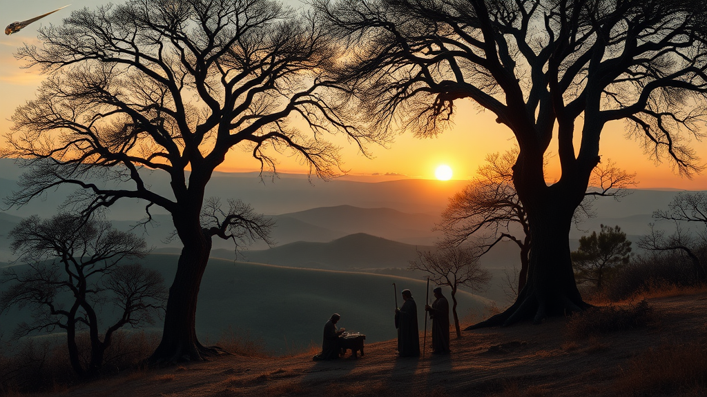 A nativity scene envisioned through the eyes of Caspar David Friedrich, drawing upon the romantic and evocative elements of his renowned landscapes. The scene unfolds in an Oriental setting, absent of snow, where ancient trees stand as silent guardians. The last golden rays of a setting sun gently illuminate the rolling hills in the distance, casting a warm glow over the serene land. Above, a comet streaks across the twilight sky, its light piercing through the encroaching dusk. In the foreground, the figures of the nativity are gathered, their forms softly contrasted against the majestic backdrop. The atmosphere is imbued with a mystical stillness, capturing the sacredness of the moment in a landscape where nature and divinity quietly converge.