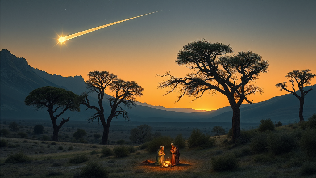 A nativity scene imagined by Caspar David Friedrich, inspired by his renowned landscapes, unfolds in the serene setting of the Orient under a dusk-tinged sky. The final rays of sunlight paint the gentle mountains in a warm, golden hue, while a comet streaks across the darkening sky, illuminating the tranquil land beneath. Majestic, ancient trees stand guard along the periphery, their silhouettes etched against the horizon. The figures of the nativity scene gather intimately in the foreground, their forms softly lit by the celestial glow. The landscape is devoid of snow, covered instead in a mosaic of earthy tones and lush greenery, giving the scene a sense of peace and timeless beauty.
