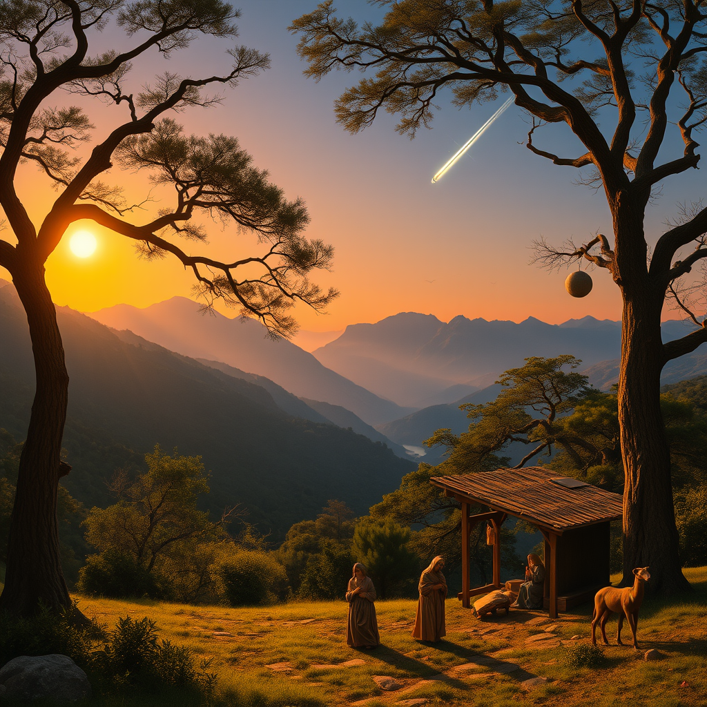 A nativity scene imagined by Caspar David Friedrich, integrating iconic elements from his renowned landscapes. The serene glow of the setting sun casts a golden hue over tranquil eastern mountains, while a luminous comet graces the twilight sky, illuminating the gentle, verdant landscape. Majestic, ancient trees frame the scene, their branches whispering stories of time. In the foreground, the nativity figures stand harmoniously amidst the natural splendor, their presence both humble and profound beneath the celestial sparkle. The warmth of the Orient envelops the tableau, enriching the sacred moment with an earthly grace.