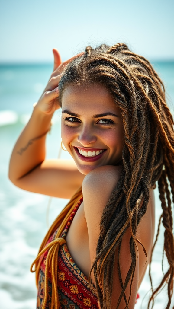 A naturally cute hippie woman with intricately braided hair stands by the sea, her joyful expression and intense gaze capturing attention. She strikes a dynamic pose, embracing the ocean breeze. Her eyes reflect the serenity of the waves, while soft, natural lighting creates a serene, harmonious atmosphere around her.
