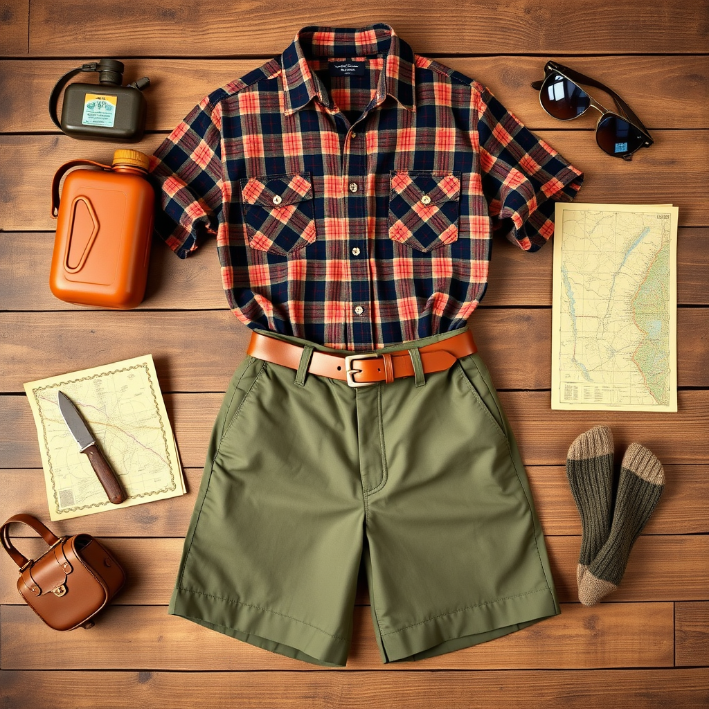A neatly arranged flat lay of 1960s-inspired camping attire featuring vintage-style fabric patterns and colors, showcasing laid-out items like a retro plaid flannel shirt, high-waisted olive green hiking shorts, a classic leather belt, and wool socks. The ensemble is accompanied by period-appropriate accessories such as a canteen, a foldable camp knife, a worn map, and a pair of round sunglasses with tinted lenses, all placed on a rustic wooden surface. Each item is captured in photorealistic detail, evoking a sense of outdoorsy adventure with a nostalgic, mid-century aesthetic.
