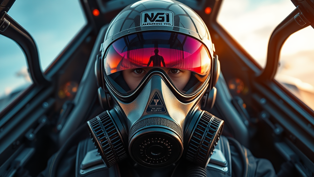A neofuturistic highly detailed portrait illustration of an individual in a sophisticated gas mask seated in the cockpit of an advanced fighter jet with a translucent visor elegantly enhancing the futuristic atmosphere of the image; the jet's controls visible in the background, merging seamlessly with the high-tech aesthetic; vibrant reflections playing across the visor and mask, capturing the complexity and depth of the scene in a 4K symmetrical portrait.
