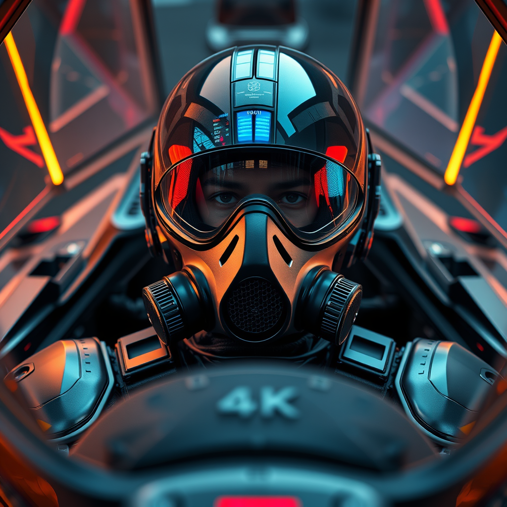 A neofuturistic highly detailed portrait of a person in a sleek, armored suit wearing a gas mask seated in the cockpit of an advanced fighter jet, the visor shimmering with digital displays adding to the futuristic ambiance of the image, vibrant reflections dance across the glass, emphasizing the high-definition 4K symmetry across the frame, subtle hints of neon lighting contour the edges, enhancing the modern, cutting-edge atmosphere.