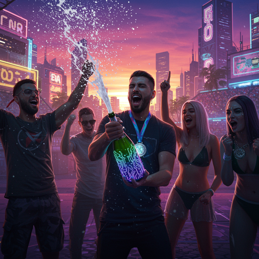 A neon-bathed cityscape glows under the vibrant hues of a setting summer sun, casting long shadows in a futuristic urban arena. At the center, a triumphant figure stands victorious, surrounded by a gleaming cohort of friends and teammates. An iridescent medal gleams around their neck, pulsating with electric blues and purples, synchronizing with the ambient city lights. In their hands, a sleek, chrome bottle of sparkling champagne, engraved with luminescent circuitry, erupts, sending a cascade of effervescent, glittering foam soaring through the air. The droplets catch the ambient light, scattering prismatic shards in every direction. Faces lit up with exuberance and triumph, the group revels in their shared moment of glory. The scene is captured from a dynamic, slightly elevated angle, emphasizing the jubilation and unity within the heart of this thriving cyberpunk metropolis.