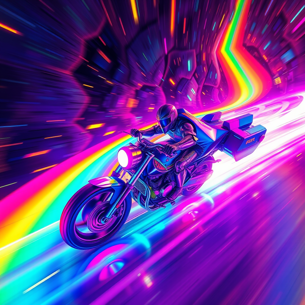 A neon-infused expedition, where a futuristic knight races at the speed of light through hyperdrive dimensions, enveloped in a vibrant, extreme rainbow stream. The journey unfolds with illuminated, intricate detail, enhanced by cinematic lighting, creating an electrifying spectacle of color and motion.