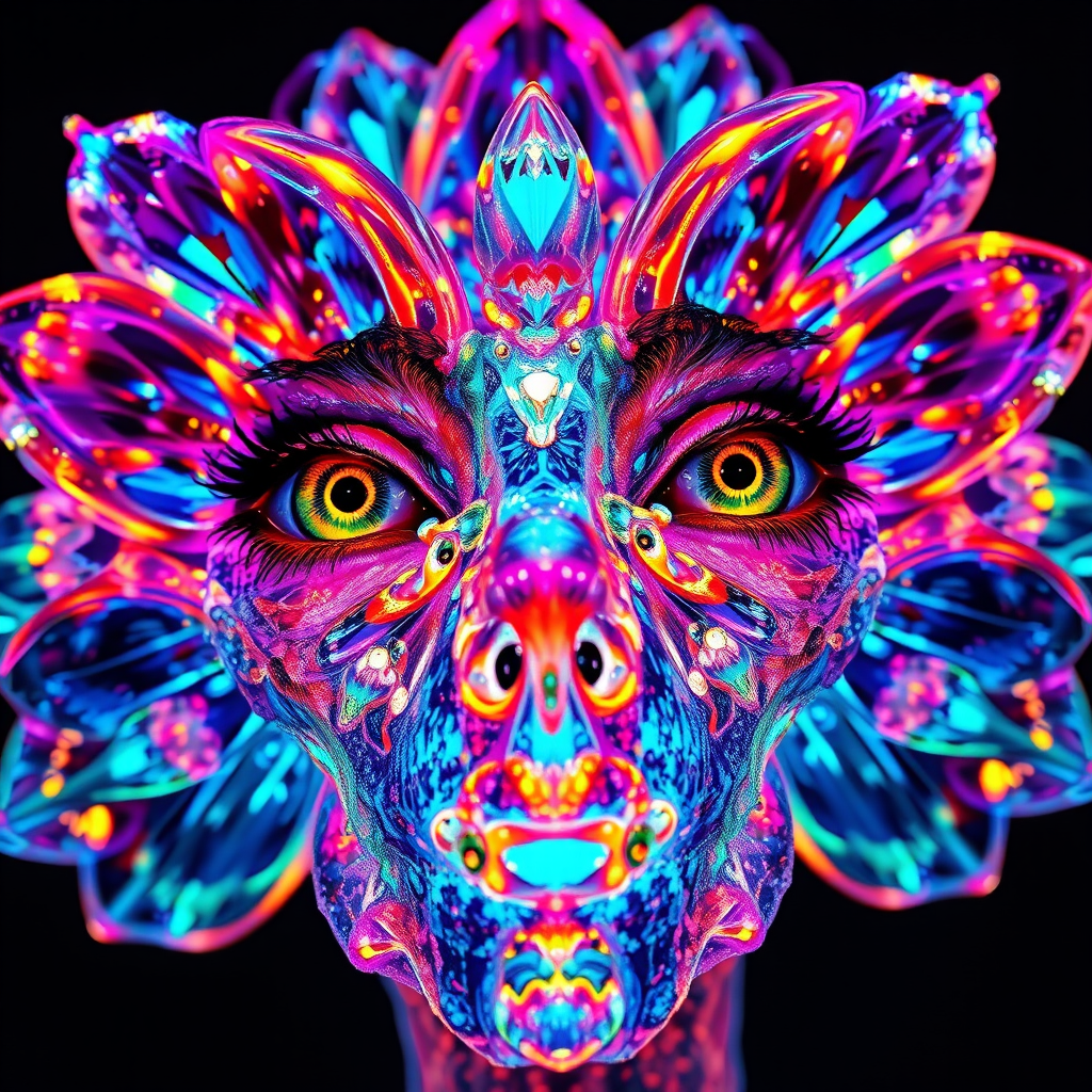 A neural network has generated an exquisite design resembling a crystalline flower, shimmering with vibrant colors that shift with every change in perspective. This highly detailed and intricate creation is enhanced by bioluminescent illumination and captivating glow effects, presented in stunning 16k UHD and HDR quality. Despite its visual brilliance, the design intriguingly incorporates abstract elements, including distorted irises and unusual pupils, giving a surreal feel to the eyes, which appear cross-eyed. The face seems duplicated with peculiar features such as extra fingers and unusual hand formations, adding an intriguing complexity. The image captures a cropped yet mesmerizing view, hinting at additional hidden details beyond the frame. Although there are no traditional markings like signatures or watermarks, the focus remains solely on the vivid, multi-angled beauty of the crystalline flower, akin to a living jewel.