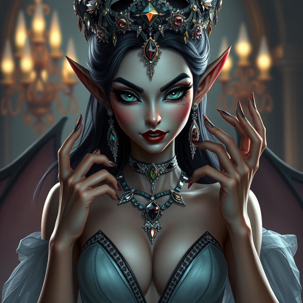 A new Disney villain emerges as a dark elf queen, her beauty surpassing all Disney princesses, with intricately jeweled facial art and strappy heels. Sporting a mesmerizing plunging neckline and a mischievous, anime-inspired expression, she embodies the elegance and allure of Disney animation. Captured in high-quality painting style with 16K resolution, UHD, and HDR embellishments, the scene highlights her otherworldly charm. Her presence is marred by an artistic edge: cross-eyed with unusual, lazy eyes, and a neck that seems just a tad too elongated. Her hands seem gracefully articulated, almost as if she has extra fingers, emphasizing her mystical nature. Although stunningly surreal, she evokes a sense of uncanny beauty, transcending typical boundaries, and captivating viewers with her enigmatic gaze and regal posture, all while maintaining an exquisite blend of fantasy and animation flair.