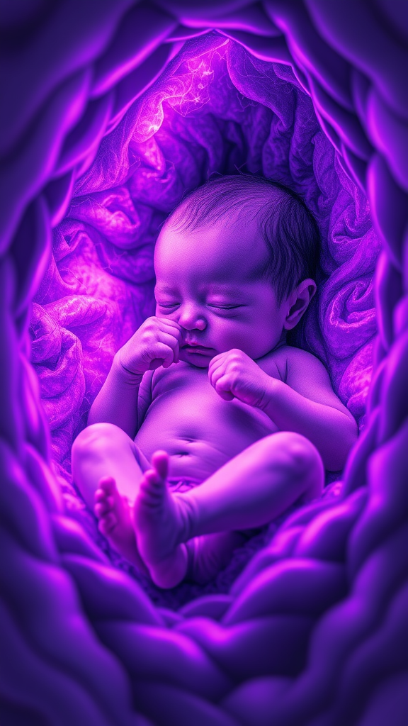 A newborn inside a womb enveloped by a mystical purple plasma and energy, showcasing exquisite design and intricate sketching. This full-body portrait captures an ultra-low angle view, emphasizing the tiny clenched fists. The scene is cinematic and photorealistic, rendered in 8k resolution with high detail. Outlines are sharp while incorporating a blur effect for dynamic composition. Inspired by Ghibli cinematics and the style of Ayami Kojima, the visual boasts 16k UHD quality with HDR technology. The vibrant imagery rivals Absurdres quality, maintaining clarity and precision. The focus is clear and centered, avoiding any distortions, blurs, or visual distractions such as watermarks, logos, text, or cropping errors, ensuring a seamless and immersive illustration.