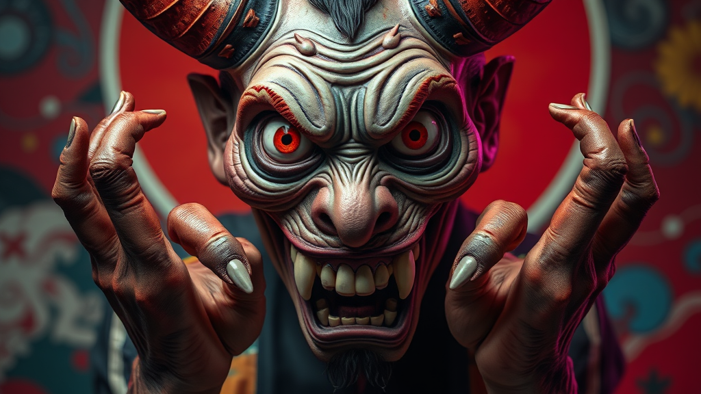 A nightmarish and menacing portrayal inspired by the eerie presence of an evil being rooted in Japanese Oni culture, showcasing a hyperrealistic and intricately detailed portrait. The image is rendered in vibrant 8k resolution, capturing a dramatic mid shot with a 2/3 face angle highlighted by side lighting, set against a vivid and colorful background. The character exhibits an unsettling, grotesque appearance with mismatched eyes, a crooked expression, and an unnerving, detailed composition. This artistic concept explores deformities and mutations, presenting an unsettling and distorted visage with poorly drawn hands and feet, alongside disfigured, out-of-proportion anatomy. The visage is intentionally exaggerated, evoking discomfort and fascination, with peculiar body positioning and strange angles contributing to the overall eerie aesthetic. Despite imperfections, the portrait remains compelling in its haunting richness and nightmarish allure.