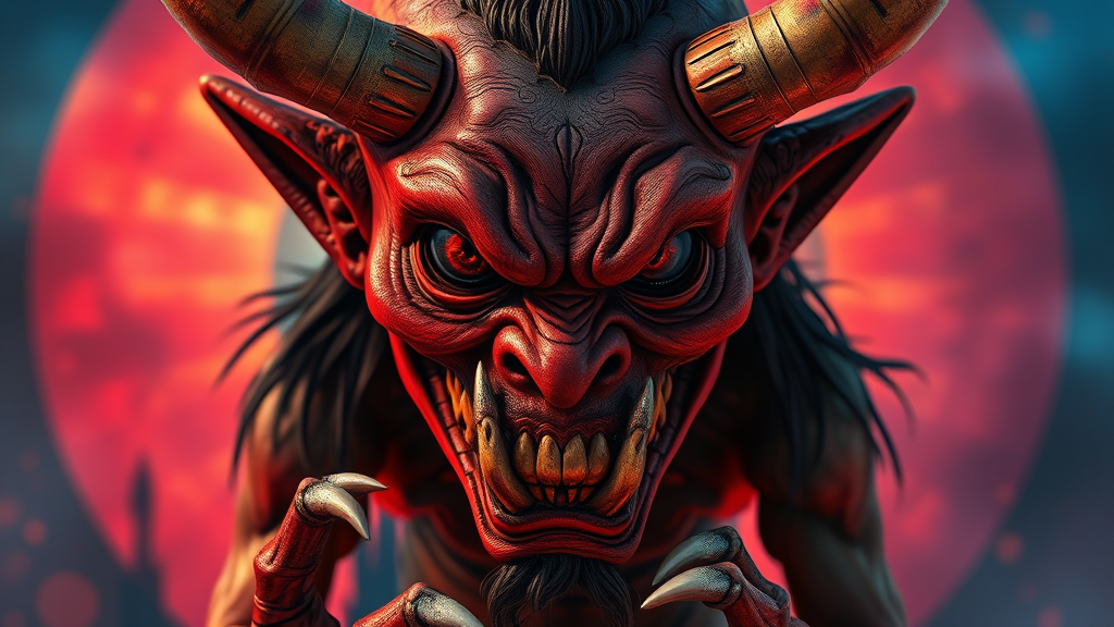 A nightmarish depiction of a sinister Japanese Oni with a highly detailed and hyperrealistic appearance. The portrait view captures the intricacy of the features in 8k resolution, focusing on the dramatic expression under side lighting. The composition highlights a 2/3 face angle against a colorful and intense background. Despite the meticulous detail, the figure is intentionally flawed with distorted anatomy and poorly rendered hands and feet. The face exhibits mismatched eyes and a crooked expression, adding to its unsettling presence. Elements such as extra limbs and disfigured features enhance the eerie atmosphere. The image is deliberately off-center with grainy textures, creating a sense of disorientation and emphasizing the nightmarish quality of the Oni.