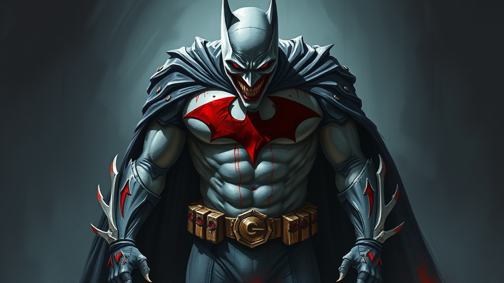 A nightmarish figure resembling Batman looms against a shadowy backdrop. The suit is an unsettling mix of ghostly white and ashen gray, while a menacing, jagged, blood-red bat symbol claws its way across the chest. Streaks of crimson accentuate the gauntlets, belt, and the tattered edges of the cape. The face is the most disturbing element – a ghostly, elongated visage twisted into a macabre, Joker-like grin. This figure exudes the eerie presence of a corrupted superhero. Rendered in digital painting with a loose, expressive style, the artwork is rich with rough brushstrokes and textured details. The contrasting color palette of stark whites and vibrant reds against the deep background creates a dramatic, haunting effect. Dim, atmospheric lighting enhances the sense of foreboding, capturing the figure's menacing and unstable nature.