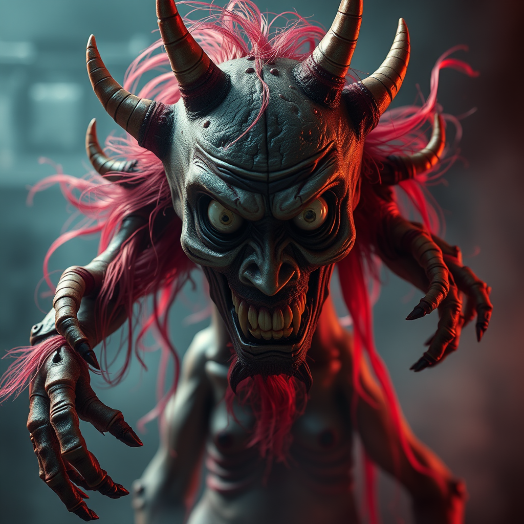 A nightmarish visual of an evil entity inspired by Japanese Oni culture, presented in a hyperrealistic, highly detailed 8k portrait view. The scene is a dramatic mid shot, showcasing an intricately detailed 2/3 face angle with striking side lighting. The background bursts with color depth, enhancing the eerie atmosphere. The entity bears a disturbing appearance, with a disfigured and deformed visage, possessing mismatched eyes and a crooked expression. Its anatomy is unsettling, featuring extra limbs, poorly drawn hands and feet, and bizarre body positions, creating an unsettling silhouette. Despite its realistic rendering, there are elements of imperfection, like grainy textures, blurred lines, and faint markings reminiscent of watermarks and signatures. The composition swirls with ethereal chaos, with an off-center focus leading to an unclear, dreamlike quality, emphasizing the nightmarish essence.