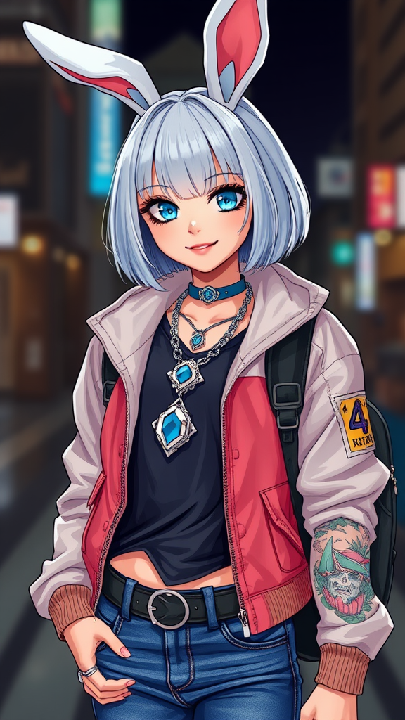 A nijigirl with bunny ears, dressed in a techwear jacket and fitted jeans, sporting a milky bob cut and a radiant, warm smile. Her large, captivating cobalt eyes are strikingly odd and beautiful. She wears a statement-making, oversized diamond necklace and carries a chic backpack. With large breasts complementing her figure, she exudes a unique charm. Her presence is accentuated by some subtle, colorful tattoos peeking out from beneath her sleeves, adding an additional layer of intrigue.