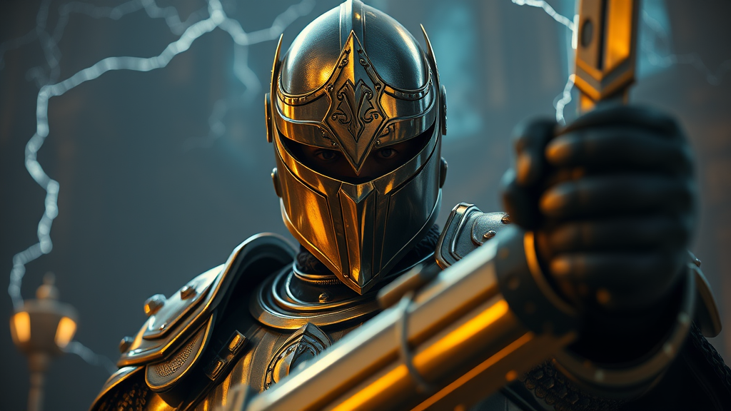 A noble knight clad in dark gold and white armor stands poised for action, captured with the intricate detail and intensity of a scene rendered in Unreal Engine. The metallic finishes of the armor gleam under aurorapunk lighting, casting a spectrum of ethereal hues. The setting is cinematic, with a backdrop that suggests both grandeur and mystery. An atmosphere of electricity and magic permeates the air, enhancing the knight's regal presence. The close-up viewpoint emphasizes the knight's intricate armor and focused gaze, adding a layer of depth and drama to this furaffinity-inspired vision. The scene is composed with a unique aspect ratio and style that conveys both tension and elegance.