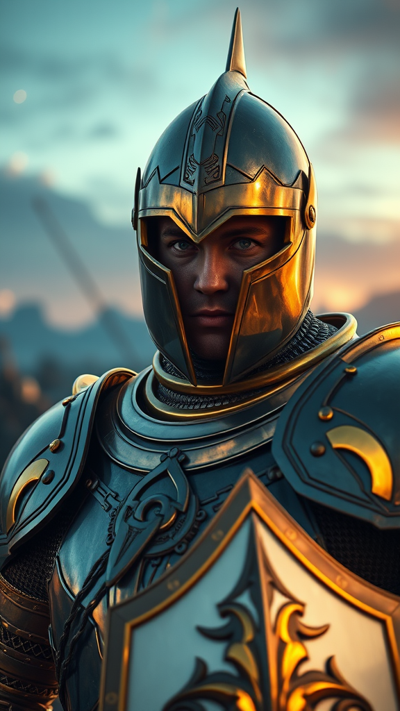 A noble knight in gleaming armor, illuminated by the ethereal glow of the aurorapunk sky, stands poised for battle. The intricate metallic finishes of dark gold and pristine white reflect the ambient light, creating a mesmerizing dance of colors. Rendered with the cinematic quality of a high-end game engine, the scene captures the intense focus and resolute determination etched on the knight's face in a vibrant close-up. Surrounded by a dramatic, otherworldly landscape, the atmosphere is one of epic fantasy, with hints of futuristic elegance. The knight's presence commands the scene, blending tradition with a visionary twist.